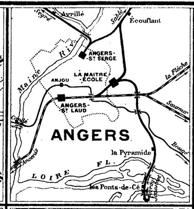 Réseau plus simple pour la ville d'Angers. On note en revanche la nécessité pour le réseau de l'Etat d'effectuer de nombreux rebroussements dans les gares d'Angers Saint Serge et La Maitre-Ecole. Notez au sud les fameux "Pont -de Cé", théatre d'une catastrophe le 4 aout 1907, lorsque le tablier du pont cède sous la locomotive. L'année suivante, le 23 juin, un rapide en provenance de la gare d'Orsay déraille à Maitre Ecole. La locomotive et les deux wagons de luxe déraillent, heureusement sans faire de victime..