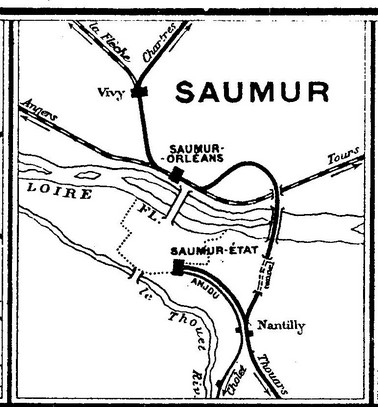 La gare de Saumur Etat, ancien terminus de la ligne Saumur Poitiers, ne voyait pas passer le trains drapeau de l'Etat. le pont sur la Loire date de 1886.
