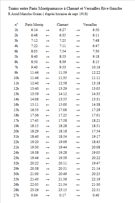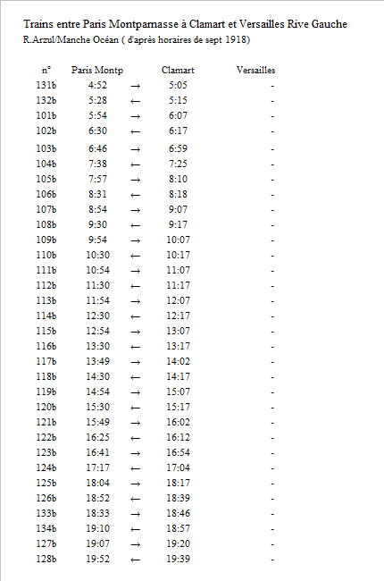 L'horaire des trains de septembre 1918 permet d'analyser l'exploitation des trains de banlieue. Au départ de Montparnasse, ils portaient un numéro impair - et donc pair pour les trains entrants. On note pas moins de 65 trains sur les deux lignes de Clamart et de Versailles RG: