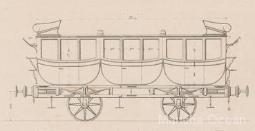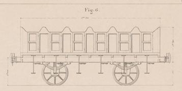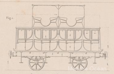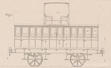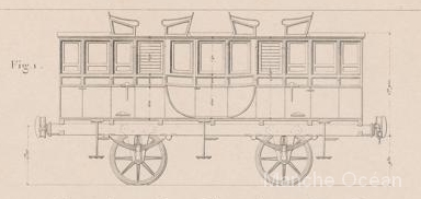 Des voitures de luxe. La construction de ces voitures, avec les faces galbées et les sièges placés en toiture sont très semblables aux dilligences de l'époque. Des berlines de première classe, selon une configuration classique de voitures à trois compartiments et fenetres de custodes arrondies.Des voitures de première à impériale. Ces voitures comportent 2 compartiments au centre et deux coupés aux extrémités. Elles comportent également deux compartiments ouverts à l'impériale. Une toiture sommaire protège des intempéries. Des "dilligences" mixtes, comportant un compartiment de première classe au centre, et deux compartiments de seconde aux extrémités. La disposition est completée de 4 sièges aux étages d'une capacité de 16 places. L'espace situé entre deux compartiment est creux, et comporte un plancher surbaissé par rapport à la toiture afin de permettre l'assise sur les places de l'impériale et au dessous des espaces pour des marchandises ou des niches à chiens. Il n'existe pas encore d'échelle pour faciliter l'accès à l'étage. Des voitures de seconde à impériale. Ces voitures comportent 4 compartiments à l'étage inférieur et un compartiment ouvert à l'impériale. Une toiture sommaire protège des intempéries. Des voitures de troisième classe. Selon une disposition usuelle de l'époque, les voitures de troisième n'ont pas de toiture, ni de siège.. la capacité de transport est de 60 places.