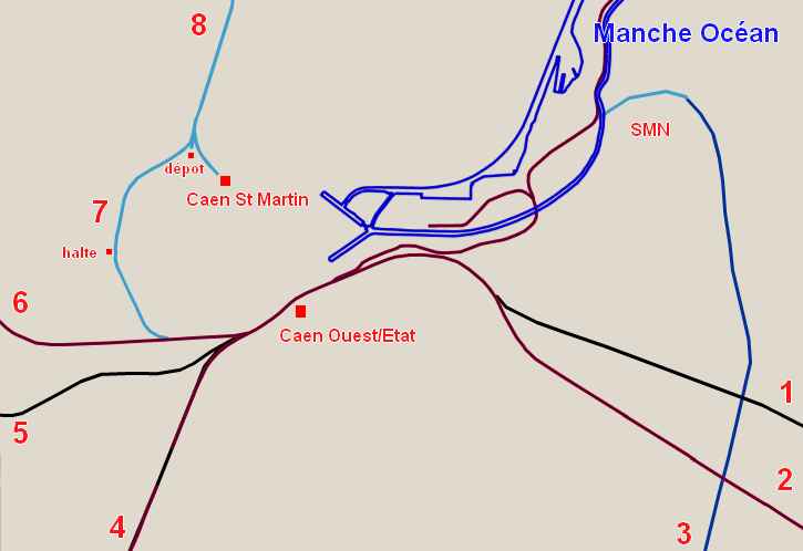 Carte des environs de Caen (source IGN) avec ajout des lignes: 1 ancienne ligne vers Troarn; 2 vers Mantes & Paris; 3 raccordement portuaire et ligne SMN vers les mines de Soumont; 4 ancienne ligne vers Flers; 5 ancienne ligne vers Vire; 6 vers Lison et Cherbourg; 7 raccordement Caen Ouest et Caen St Martin; 8 ligne du Caen à la Mer au départ de la gare de Caen-St-Martin.