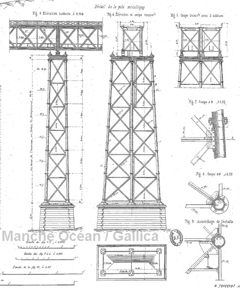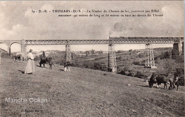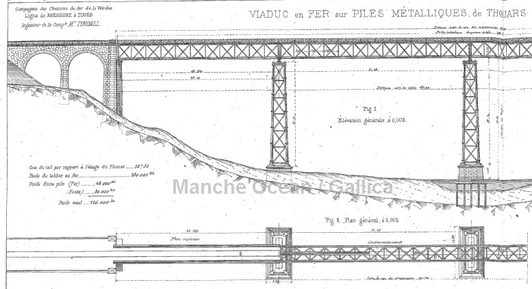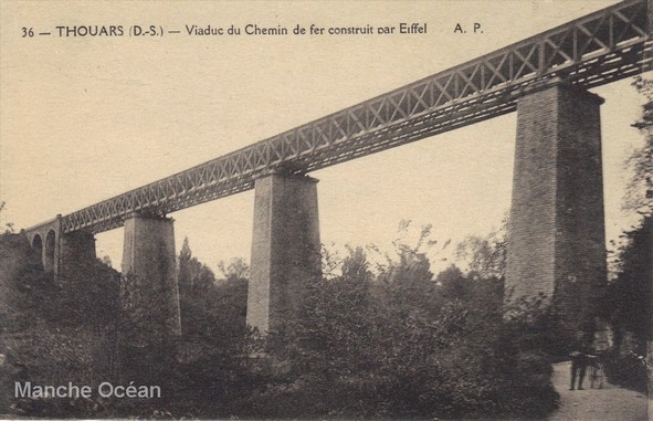 Le viaduc de Thouars, construit en 1872, est un des rares construit à l'origine avec des piles métalliques. Commandé par la compagnie de la Vendée pour la ligne Tours - Les sables d'Olonnes, l'ouvrage conçu par les Etablissements Eiffel ne comportait à l'origine qu'une seule travée métallique pour une voie, placée au mileu des piles prévues pour deux travées. L'ouverture de l'axe Paris Bordeaux en 1887 a nécessité de doubler la voie et de riper la travée centrale pour construire la deuxième travée. Les dimensions des éléments etaient les suivantes: 2 travées métalliques centrales de 51m480 formées de 13 panneaux de 3,96m , deux travées métalliques latéralles de 43,560m formées de 11 panneaux de 3,96m, piles métalliques de 27,6m de hauteur.