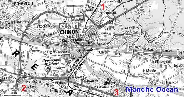 Carte actuelle des environs de Chinon (source IGN) avec ajout des lignes: 1 vers Tours; 2 vers Loudun et Thouars, 3 vers Richelieu