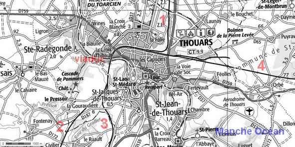 Carte actuelle des environs de Thouars (source IGN) avec ajout des lignes: 1 vers Parthenay et Chartres; 2 vers Bressuire et la Roche sur Yon; 3 vers Niort et Bordeaux; 4 vers Tours