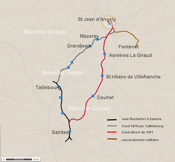 En 1911, l'État réalise un raccordement direct entre St Jean d'Angely et Saintes. L'itinéraire passe alors par les gares d'Asnières-la-Giraud, Saint-Hilaire-de-Villefranche, Le Douhet.