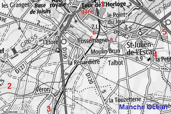 Carte actuelle des environs de Saint Jean d'Angely (source IGN) avec ajout des lignes: 1 vers Niort & Paris; 2 ancienne ligne de 1878 vers Saintes et Bordeaux par Taillebourg; 3 ligne de 1911 vers Saintes et Bordeaux ; 4 raccordement militaire au camp de Fontenet; 5 ancienne ligne métrique vers Cognac; pont sur la Boutonne (a) de l'ancienne ligne; ponts sur le canal de St Eutrope (b) et sur la Boutonne (c)