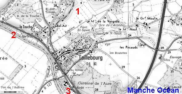 Carte actuelle des environs de Taillebourg (source IGN) avec ajout des lignes: 1 ancienne ligne vers St Jean d'Angély et Paris; 2 vers Nantes, 3 vers Saintes