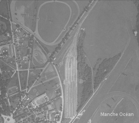 Vue aérienne de la gare du champ de courses de Mainsons Laffitte en 1919. On distingue les 10 voies , la voie de manoeuvre et son pont tournant (source IGN)