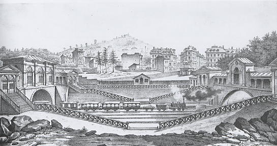 Implantation de la gare vers 1855. Le batiment voyageur, en forme de U, donne sur la place du Havre.