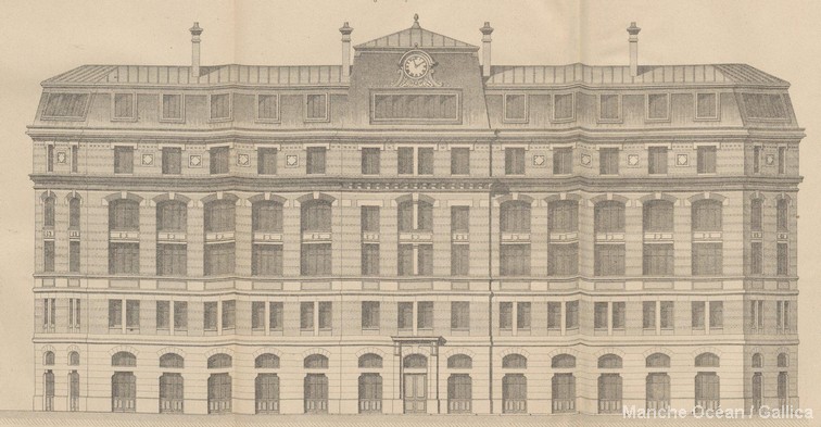 Dessin d'un projet vers 1885. Notez la partie centrale comprenant 3 verrières (coll part.).