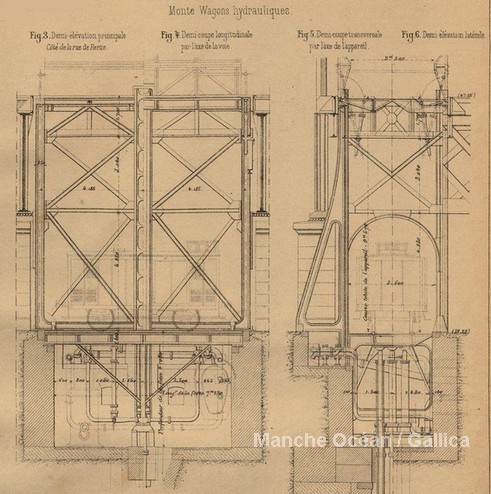Monte wagon hydraulique du service des messageries (source Gallica BNF)