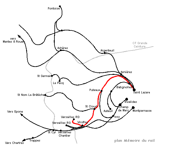 La ligne de Paris à Versailles Rive Droite part de la gare de Paris Saint Lazare. Elle a un parcours commun entre Paris et Asnières avec les lignes de Saint Germain, Mantes par Achères et Mantes par Argenteuil.
