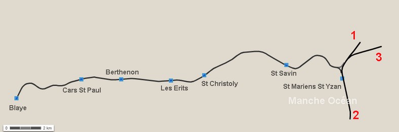 Carte de la ligne de Blaye avec ajout des gares.
