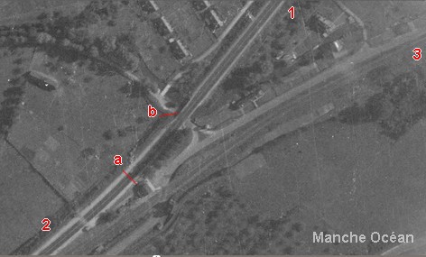 Vue aérienne de Petit Appeville de 1939 (source IGN) avec ajout des lignes: 1 vers Rouen; 2 vers Dieppe; 3 vers Offranville; maison de garde du pn sur la ligne d'Offranville (a); pont sur la scie et route (b)