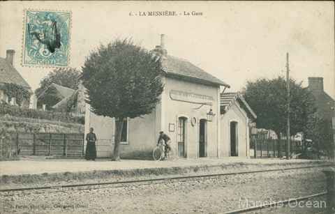 Batiment voyageur de la gare de La Mesnière. Noter le nom de la gare occupant quasiment l'ensemble de la façade.