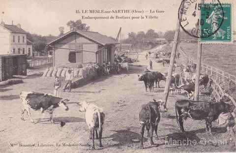 Chargement de bétail en gare du Mesle-sur-Sarthe sur la ligne d'Alençon.