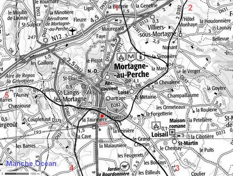 Carte actuelle des environs de Mortagne (source IGN) avec ajout des lignes: 1 vers Ste Gauburge & Mesnil Mauger; 2 vers Bernay; 3 vers Condé sur Huisnes, 4 vers La Hutte Colombiers et Sillé le guillaume; 5 vers Alençon. Ligne de Mortagne à Mesnil Mauger: