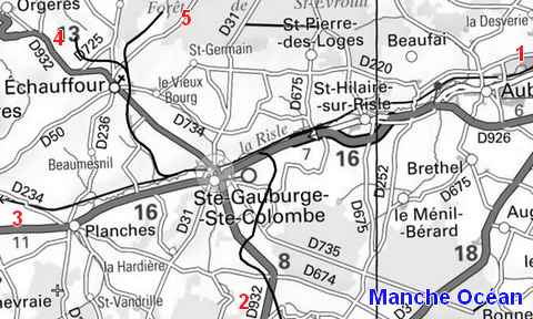 Carte actuelle des environs de St Gauburge (source IGN) avec ajout des lignes: 1 = vers Dreux & Paris ; 2 = vers Mortagne; 3 = vers Argentan & Granville; 4 vers le Mesnil Mauger &Mezidon; 5 vers Bernay.