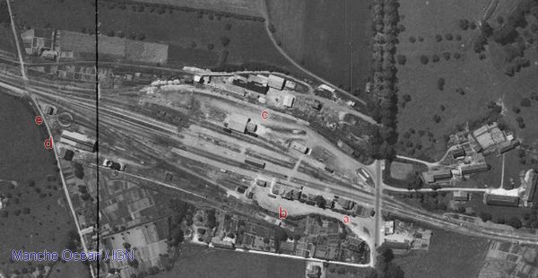 Vue aérienne de Mortagne en 1947 (source IGN) a = bâtiment voyageur de 1873; b = bâtiment voyageur Ouest; c = halle marchandises; d= remise à machine; e = plaque tournante.