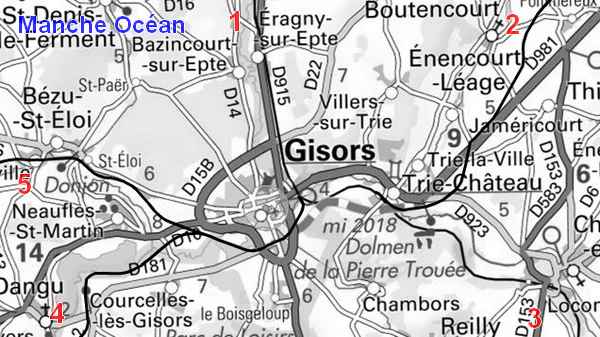 Carte actuelle des environs de Gisors (source IGN) avec ajout des lignes: 1 = vers Gournay en Bary, Serqueux et Dieppe; 2 = ancienne ligne vers Beauvais; 3 = vers Pontoise et Paris; 4 = ancienne ligne versVernon et Pacy sur Eure; 5 = ancienne ligne vers Pont de l'Arche (actuelle voie verte) Ligne de Gisors à Vernon