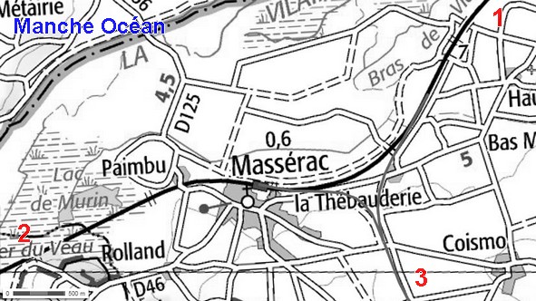 Carte actuelle des environs de Masserac (source IGN) avec ajout des lignes: 1 vers Rennes; 2 vers Redon, 3 anciennes lignes de Redon à Chateaubriant et Besle à Nantes Etat (désormais GR des trois rivières)