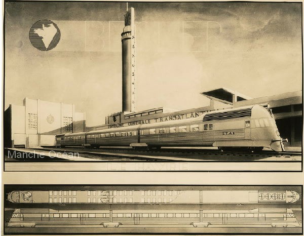 Projet du Train Besler - Budd à deux motrices et une remorque intermédiaire, devant la gare maritime du Havre (DR/source inconnue)