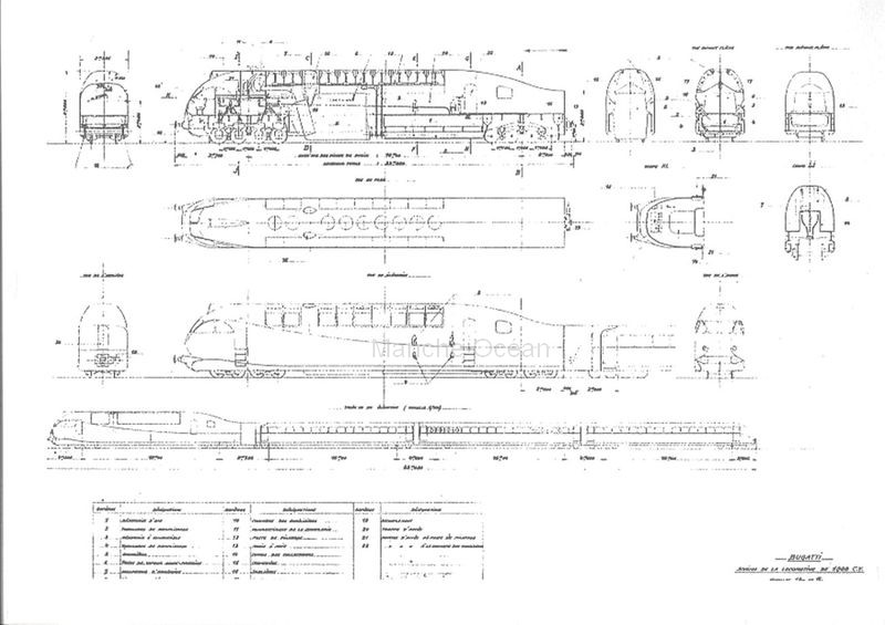 Le projet est présenté tout d'abord à Raoul Dautry, alors président du réseau de l'État, qui attribue à Bugatti un marché pour le développement d'un train de 1000 cv. Plus tard, c'est le PLM qui s'intéressera au projet et commandera une étude d'un train de 2000 cv. Le train à vapeur PLM comporte une motrice de 2000 cv, avec un kiosque de conduite situé en hauteur au centre du véhicule. D'un empattement de 15 m, la motrice semble être équipée sur ses faces latérales des ouïes destinées à effectuer les échanges de chaleur nécessaires à la condensation. Les deux bogies sont moteurs. Le train est complété de 4 voitures, dont une voiture équipée de baies circulaires servant probablement de fourgon.