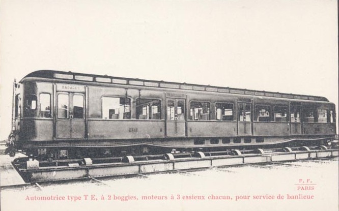 1913: Les automotrices de première série TE 1001 à 1018À partir de mai 1913, le réseau de l'État fait circuler un matériel différent particulièrement adapté au trafic banlieue et inspiré du matériel du métropolitain. Les automotrices TE 1001 à 1018 sont métalliques et comportent des bogies à deux essieux dont le balancier est contre coudé. Un compartiment fourgon est disponible à proximité du poste de conduite.