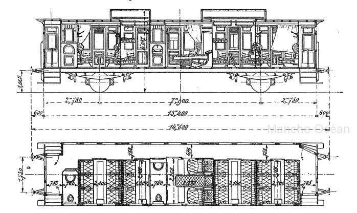 Voiture Acz avec compartiments couchettes type 1899. Les grands coffres au dessus des compartiments-couchettes donnent plus d'espace pour poser les bagages
