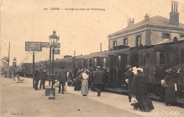 Voitures à couloir partiel en gare de Lison vers 1900, avec une voiture de 2eme coté compartiment portes ouvertes, puis une voiture de 2eme coté couloir.