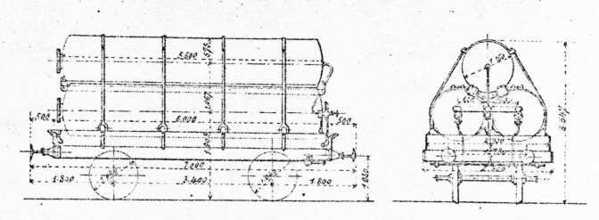Wagon réservoir à gaz. L'entraxe correspond plus aux dernières séries construites par l'Etat.