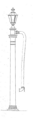 Ces grues à eau sont constituées d'une colonne en fonte coiffé d'un réverbère à gaz. La colonne est creuse et comporte une conduite interieure qui débouche au sommet de la colonne en fonte. Un tuyau de gaz court le long de cette conduite pour alimenter le réverbère. L'alimentation de la machine s'effectue par un tuyau souple à l'aide d'un volant ouvrant une vanne située en sous sol.