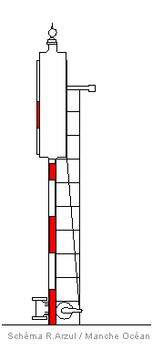 Une autre palette constituée d'un rectangle rouge, remplacé après 1885 d'un damier rouge et blanc, peut elle aussi se placer devant cette lanterne. En position repliée, les plaques mobiles sont masquée par une tole verticale fixée au mat.