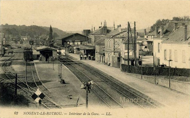 Signaux en gare de Nogent le Rotrou. Au centre un indicateur de direction, au centre du quai un signal d'arrêt.