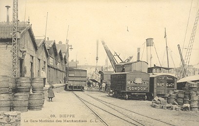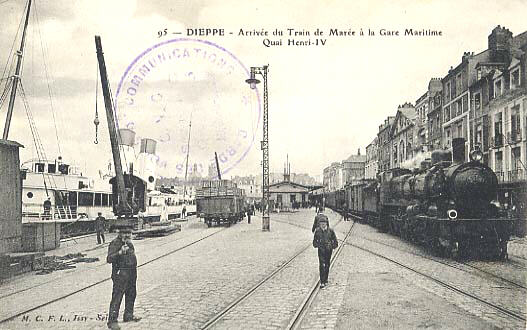 Manoeuvre d'un train de marée à l'extrémité des quais (coll R.Arzul) 1903 est une date importante pour la ligne Paris-Londres : le port de Dieppe a été dragué, et les navires peuvent désormais entrer et sortir sans tenir compte des horaires de marées. Ceci permet d'avoir des horaires fixes pour les trains et navires employés sur la ligne.