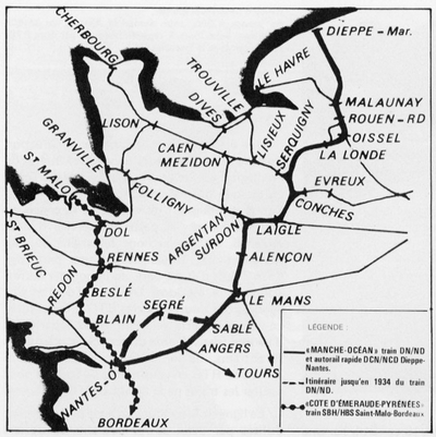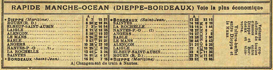 Après 1932, le restaurant est remplacé par une voiture buffet, plus adaptée à des relations transversales et plus rentable. Aussi l'horaire de 1938 mentionne des voitures-couchettes de toutes classes entre Dieppe et Bordeaux et une voiture-buffet entre Dieppe et le Mans