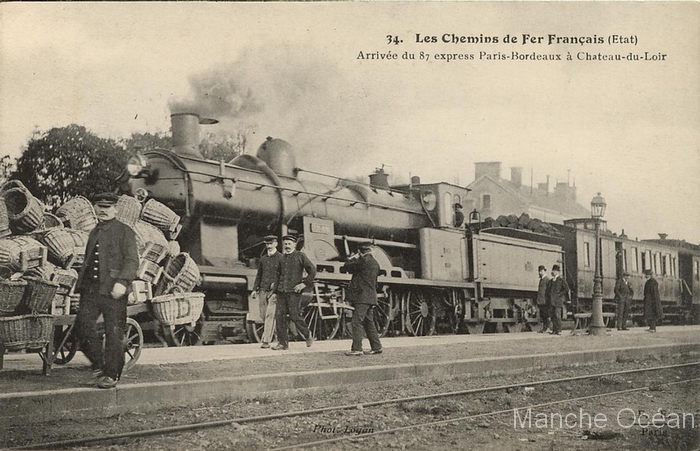 Le train 87 Paris - Bordeaux à Château-du-Loir. La machine est une Atlantic 221-101 à 110.