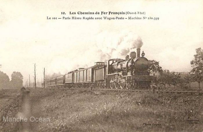 Rapide 101 Paris Le Havre, remorqué par la 230-599, ex-230 2799. Il comporte un fourgon Etat type 1910, un wagon poste , et probablement une première et deux seconde classe à bogie teck (coll R.Arzul)