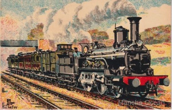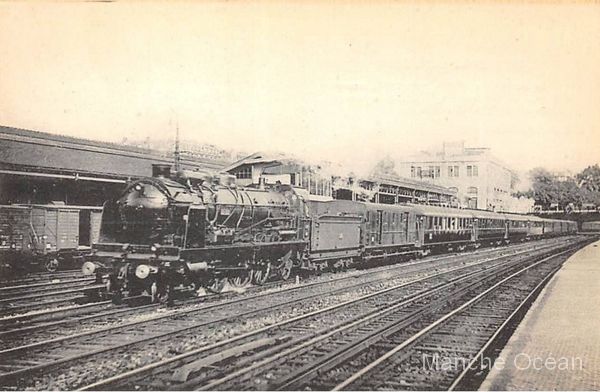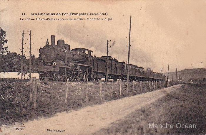 L'express 108 Paris - Le Havre. Il est tracté par la 230-581, ex 2781 Ouest de 1907-1908. derrière le fouron à essieux Ouest, on distingue une voiture à couloir partiel.