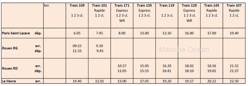 En 1923, la liaison comporte 8 trains journaliers, avec deux trains 109 et 101 passant curieusement par la gare de Rouen Saint Sever (RG) qui nécessitait un rebroussement. Les deux trains express 171 et 129 proposent un service de restauration, probablement assuré à bord des voitures de la série 2403 à 2424 de la CIWL. Le rapide 101 parcours les 228 km en 3h15, soit une moyenne d'environ 70 km/h, avec un arrêt en gare limité à 15 mn en gare de Rouen. Des gains de temps ont également pû etre réalisés par la pose d'une prise d'eau en marche installée à Lery-Pose (28) .