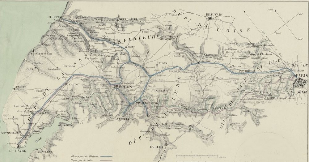 Tracé du projet Frissard du "Paris à la Mer" en bleu passant par les plateaux, avec ses embranchements de Blainville à Dieppe et de Charleval vers Louviers, Elbeuf et Saint Sever (Gallica -BNF)