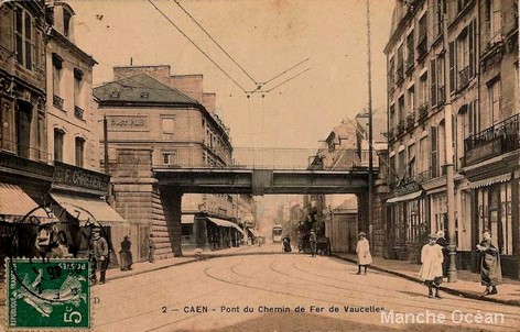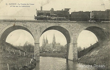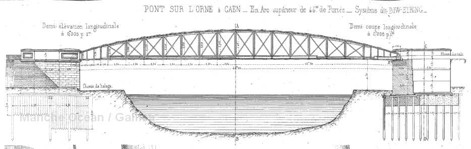 La ligne de Caen à Cherbourg comportaient deux ponts de type Bow-strings construits dès l'origine de la ligne. Ces ponts métalliques étaient réalisés selon la technique du pont de Windsor construit par Brunel. Ici la poutrelle supérieure formait un arc, tandis que la poutrelle inférieure supportant la voie formait raidisseur. Les deux arcs étaient reliées entre eux par des poutrelles verticales et diagonales. L'un était situé en aval de Caen sur l'Orne, et a une portée de 44 m. Le second est situé à la sortie de la gare primitive d'Isigny sur mer, et a une portée de 40 m completé de deux ponceaux de 3,5 mètres situés de part et d'autre du pont.