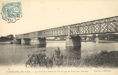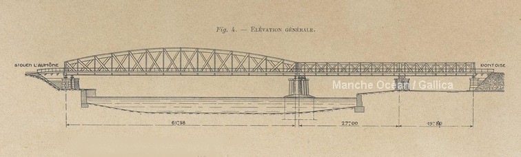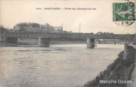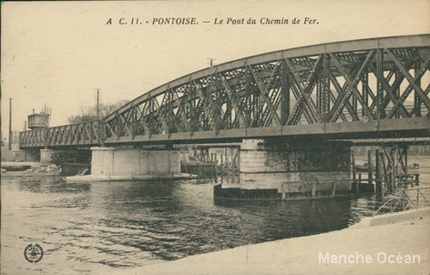 Ouvrages d'artUn des ouvrages les plus importants est situé sur l'Oise, à l'entrée de la ville Pontoise sur la ligne de la compagnie du Nord. Ce pont, construit entre 1860 et 1863, est d'une longueur de 106 m. Il est constitué de plusieurs travées d'inégales longueurs et porté par 3 piles et deux culées. L'ouvrage est endommagé pendant la guerre de 1870 puis réparé. Il subit ensuite quelques améliorations: renforcement des entretoises en 1886, renforcement des treillis et poutres au droit des appuis en 1891, remplacement de certains des appuis à friction par des appuis à rouleaux entre 1891 et 1899, remplacement des longerons en fer par des longerons acier en 1906.