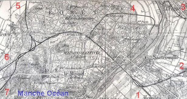 Carte d'état major de 1902 avec ajout des lignes: 1 vers Paris, 2 vers ; 3 ligne d'Argenteuil; 4 raccordement à la gare du champ de courses; 5 vers Epone; 6 vers Rouen ; 7 vers Versailles.
