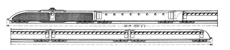 Le train vapeur Bugatti du PLM. Le train comporte une motrice de 2000cv à deux bogies moteurs, avec kiosque en toiture, un fourgon, et trois voitures voyageurs.(source Railway Gazette du 17 mai 1935)