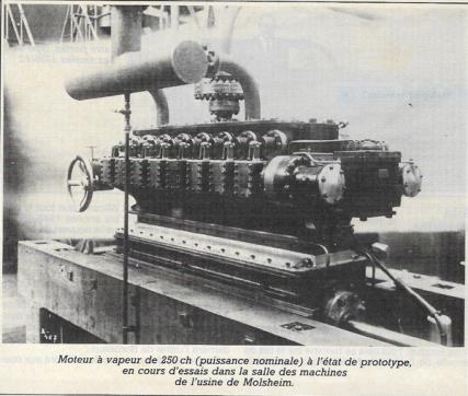 Vue du prototype du moteur à vapeur Bugatti en test à Molsheim.