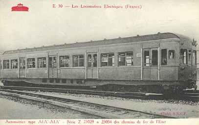 1925-1930: Les automotrice de 4eme et 5eme sérieLe réseau de l'État complète son parc à partir de 1925, avec la réception de 95 automotrices. Elles sont semblables aux automotrices de troisième série, à l'exception de l'entraxe des bogies ramené de 3 m à 2,60 m, et l'aménagement intérieur comportant un compartiment de 1ere classe situé au niveau de la porte centrale.