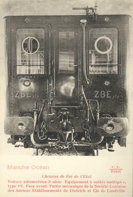 1913: Les automotrices de première série TE 1001 à 1018À partir de mai 1913, le réseau de l'État fait circuler un matériel différent particulièrement adapté au trafic banlieue et inspiré du matériel du métropolitain. Les automotrices TE 1001 à 1018 sont métalliques et comportent des bogies à deux essieux dont le balancier est contre coudé. Un compartiment fourgon est disponible à proximité du poste de conduite.