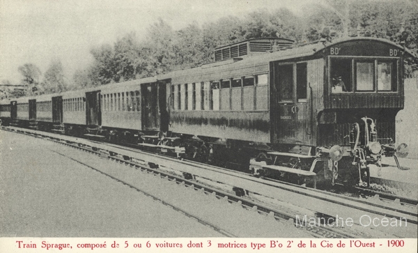 1901: les motrices Sprague - ThomsonA partir de 1901, les chemins de fer de l'Ouest décident l'essai du dispositif dit "à unités multiples" utilisé sur le matériel du Métropolitain, dont la ligne 1 a été ouverte tout récemment dans le cadre de l'exposition de 1900.