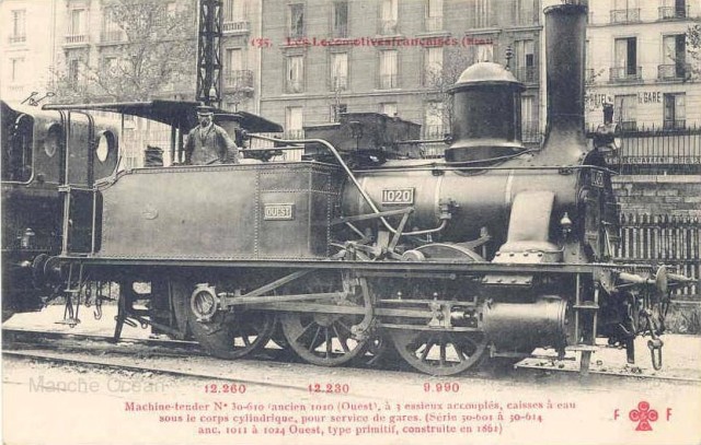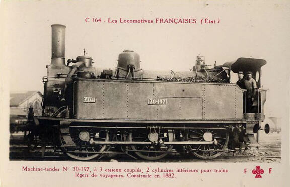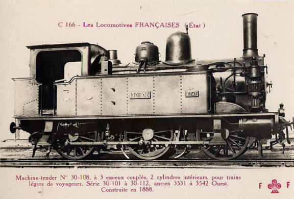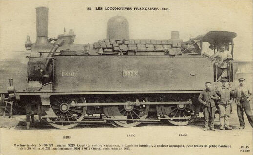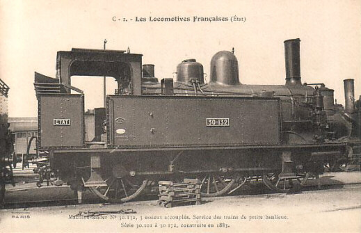 1883: les locomotives 3001 à 3031Ces locomotives à roues de 1,44 m sont construites selon un type Anglais afin d'assurer la remorque des trains mixtes des lignes secondaires. Après la construction du prototype en 1883 dans les ateliers de la compagnie, les machines seront construites par deux constructeurs: Schneider pour les machines 3002 à 3016, et Cail pour les 3017 à 3031.